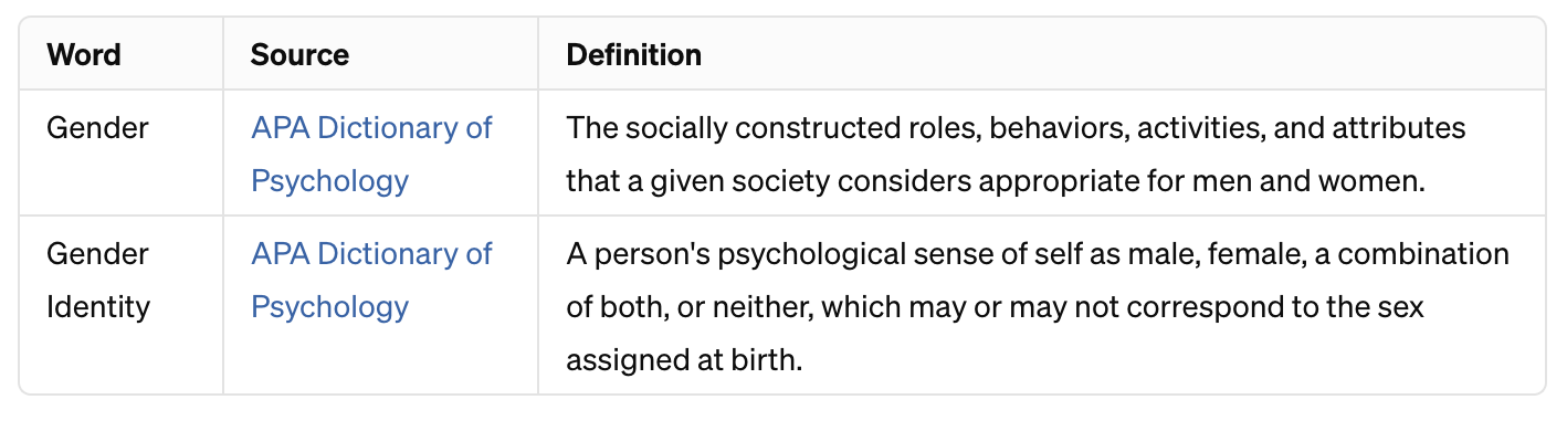 根据 APA Dictionary,Gender 是「特定社会认为适合男性和女性的社会角色、行为、活动和属性」。