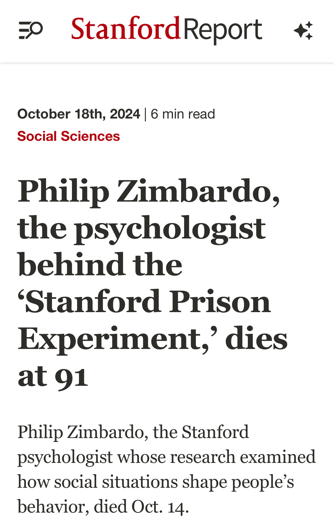 根据斯坦福邮报昨日报道,著名「监狱实验」提出者、心理学家菲利普 · 津巴多于 2024 年 10 月 14 日逝世,享年 91 岁。