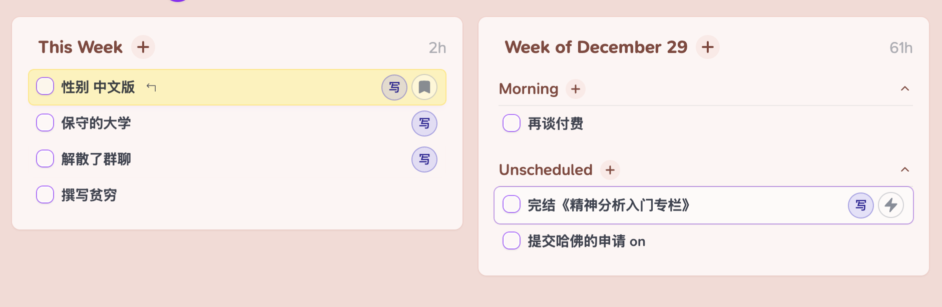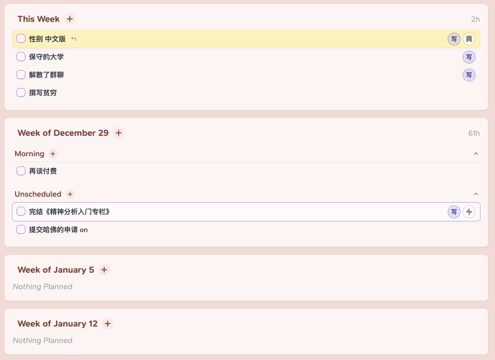 - 中间是天/周的融合视图,让我们更加专注于每天和每周的任务。