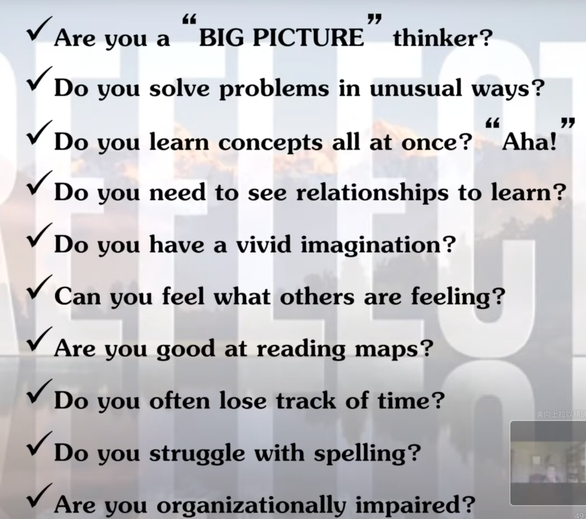 视觉空间学习者倾向于使用右脑思维,他们以整体方式体验世界,而非线性、逐步地处理信息。他们是“大局思考者”,常常通过直觉或脑海中的图像瞬间理解复杂概念。这种“啊哈!”的顿悟式学习方式,使他们在传统课堂中显得格格不入,因为学校更偏好听觉-顺序型学习者(Auditory-Sequential Learners)——那些能按步骤“展示过程”的学生。