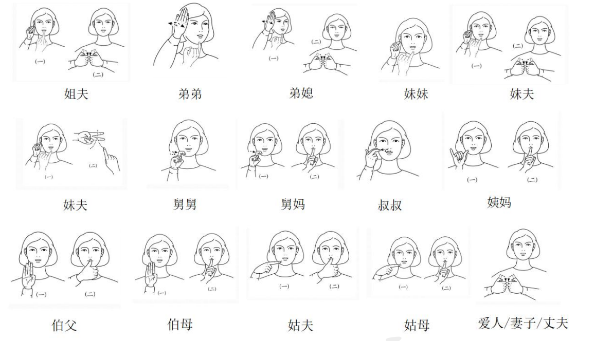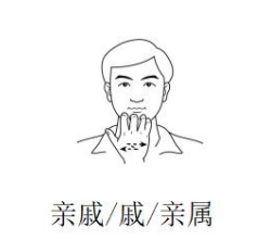 所有和亲戚、亲人有关的手语都在「嘴唇」和「头」组成的空间中发生。打法如下,四肢弯曲在嘴唇左右来回即可。