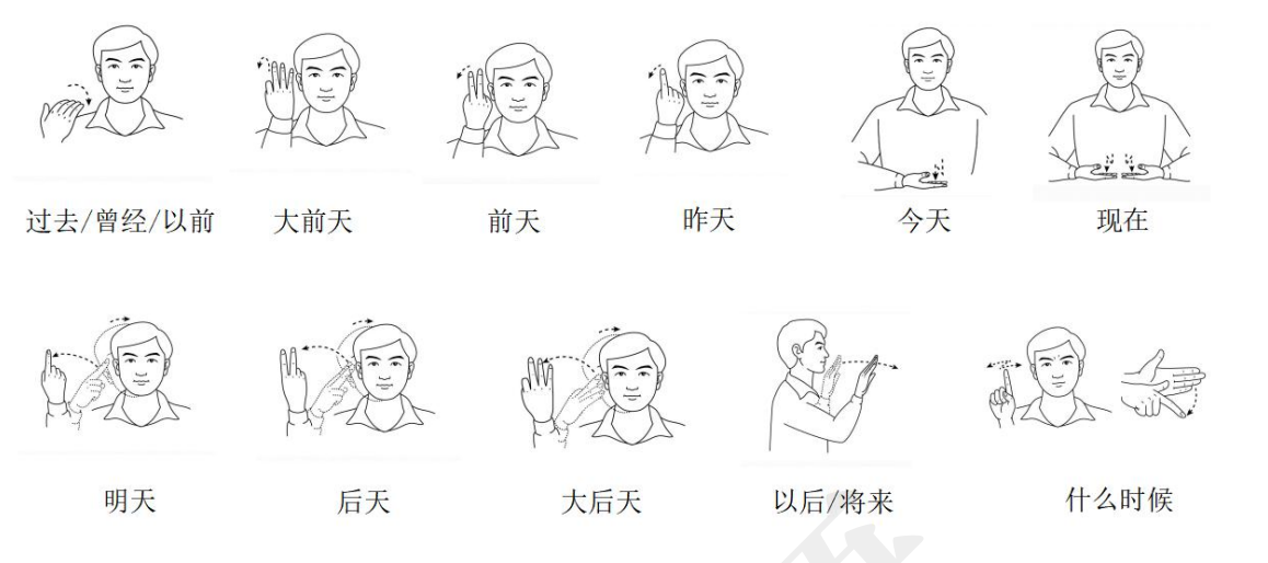 空间和位置的关系在第三次课的学习中被强化了。第三次课,我们学习了时间(年、月、日、星期、早中晚、四季……)。说实话,在表示大前天、大后天的时候,手语比说话简单一点儿。