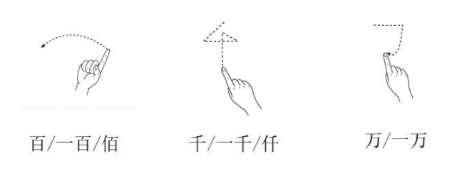 数字也存在象形和空间。比如「百」是第一笔横,「千」是笔划,「万」是竖弯钩。加上手指的数字指代,会变成一百两百……三千四千……五万六万等等。