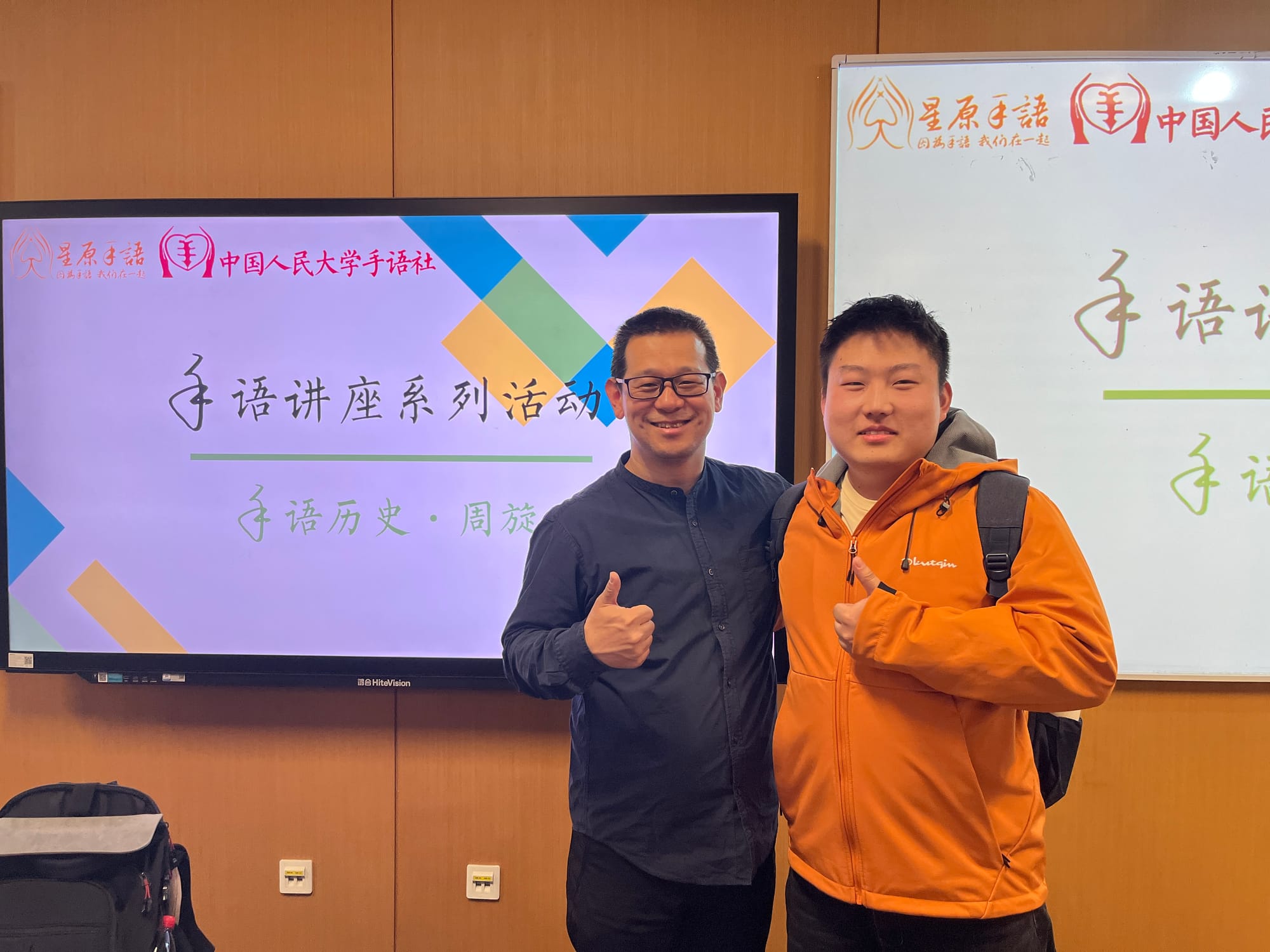 课后,我又参与了在人民大学开设的关于聋人文化和历史的讲座。主讲人是周旋老师,是全国通用手语采集组成员,也是一位聋人,领域内的前辈。