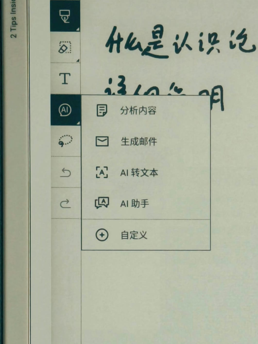 AI 对于中文手写的识别率不是很精准,五次里大概只有一两次。可能是我书写不是很规范,所用的笔也可能会带来影响。这一点比较因人而异,但是英文的手写识别率要高不少。三个 AI 预设助手功能都是在识别文字的基础上再进一步操作。实际使用中,生成邮件和分析内容都比较好。