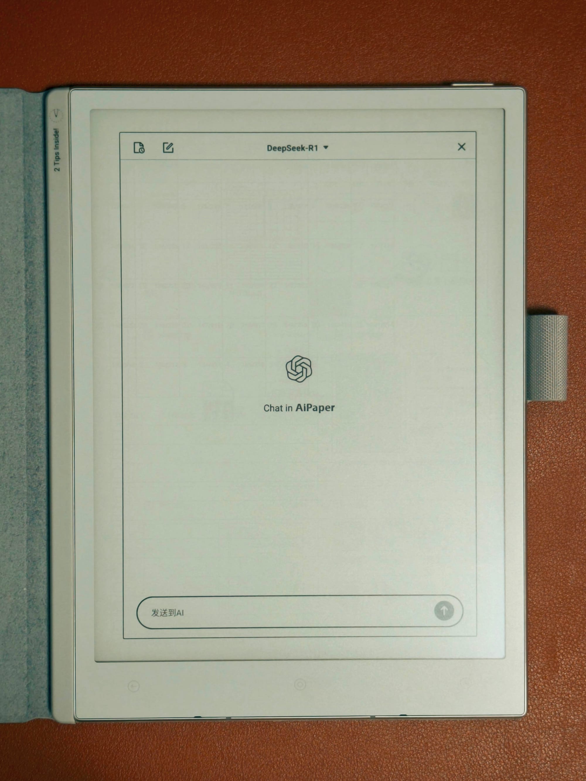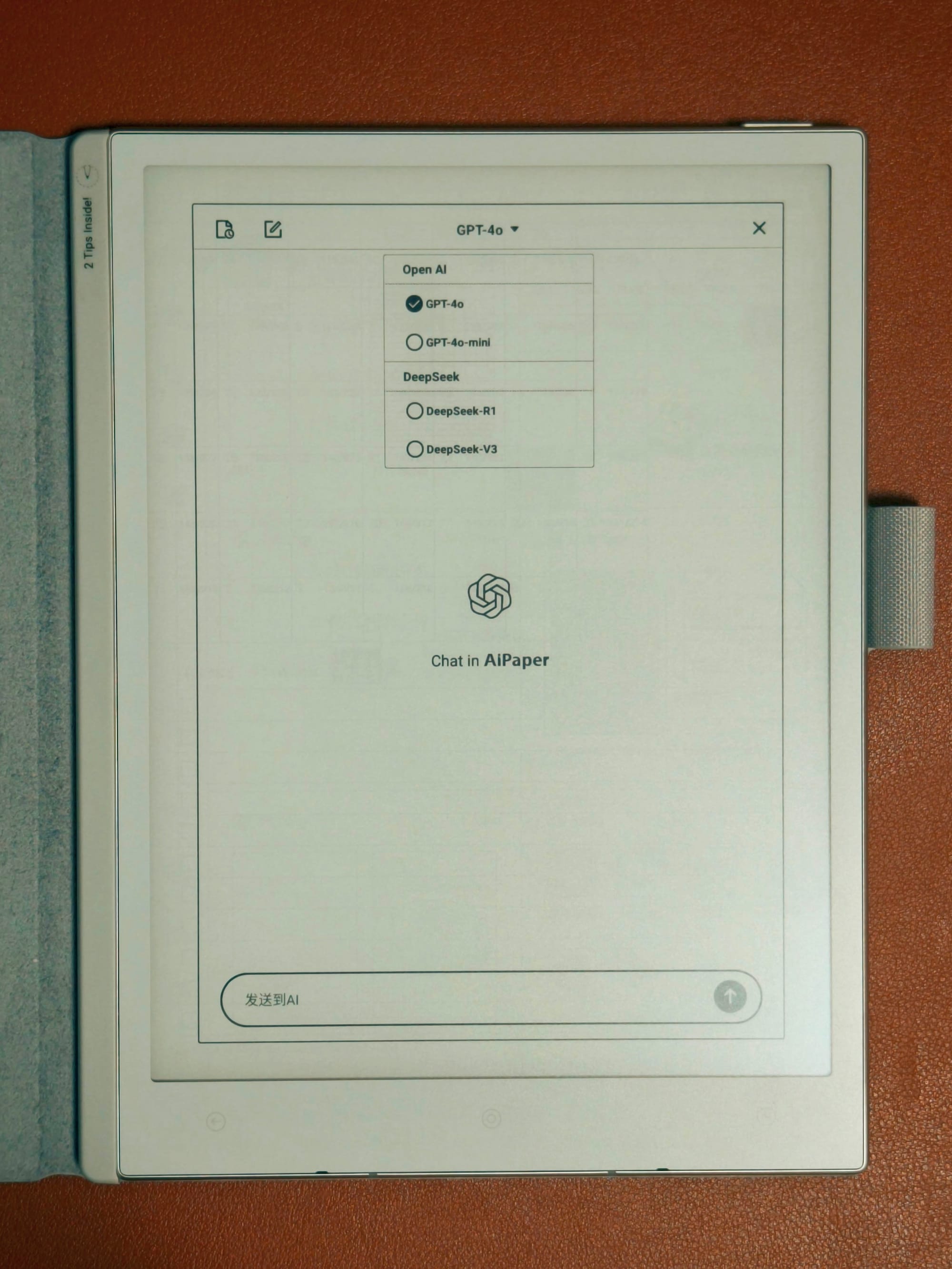 一个使用上的小技巧是,你可以先写问题,再唤起「分析内容」,它会自动为你解答;或者使用 AI 助手,进行进一步的提问。由于墨水屏的刷新显示和输入方式并不丝滑,我几乎没怎么用过自定义的功能。3 个 Agent 足够满足日常需求。有一点需要注意的是,因为它们都是先识别图片,再生成内容,所以默认的模型是 GPT-4o。即使将其在 Chat 界面(你只能在 Chat 界面更换模型)更换模型为 DeepSeek,在侧边栏唤起时,默认分析图片也只是 GPT,你接下来输入的文字,才会被 R1 回应