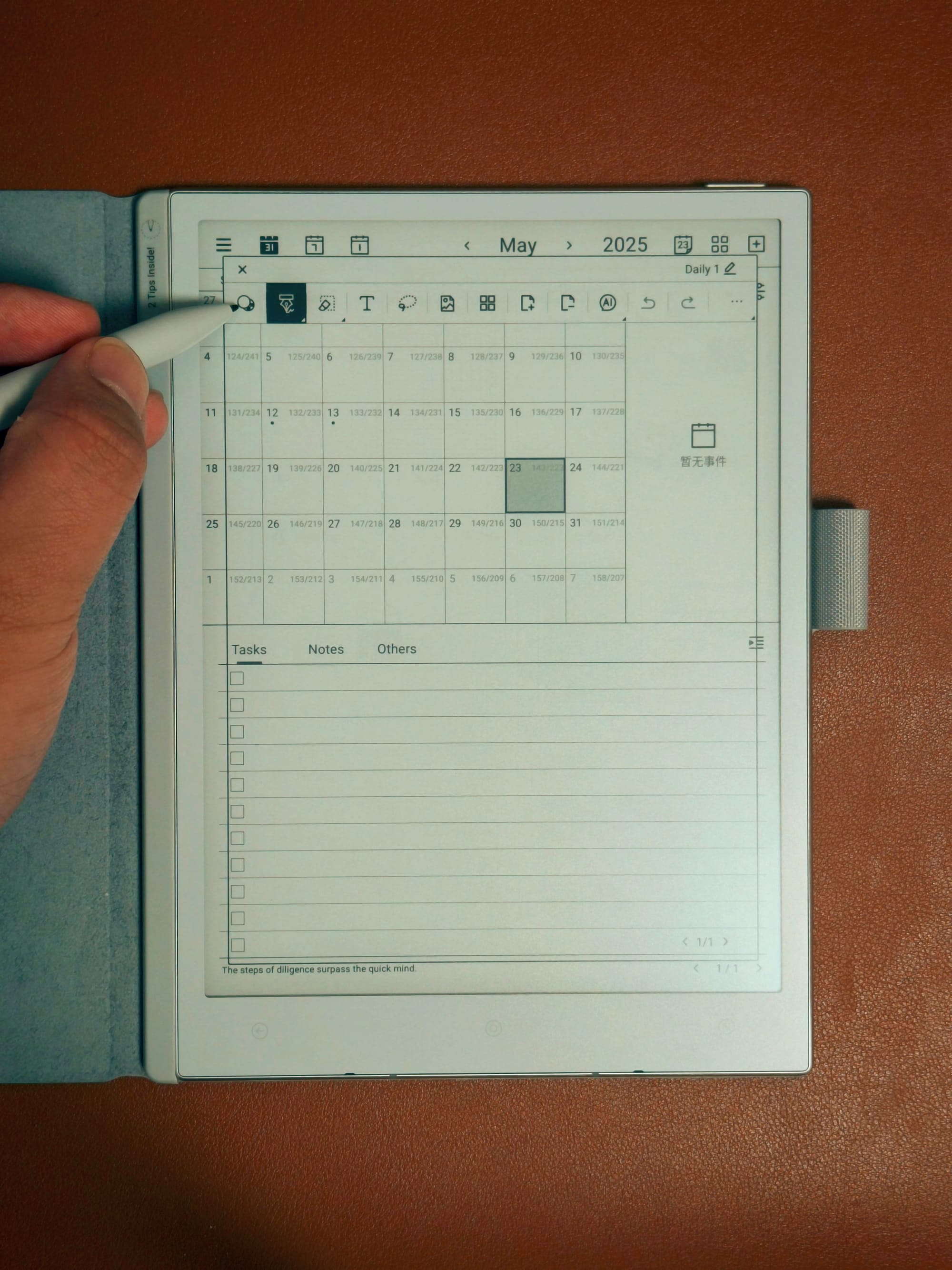 在 Others 板块中,以横向排列的方式,展现了当天已经记录的笔记(Paper)、记录的会议(Meeting)、上传的文件(Learning)和截图摘录(Pickup)。在页面中,我们既可以在当天快速上课、学习、开会快速开始记录,也可以在一天结束的时候,优雅地回顾、梳理发生的一天。默认视图是月视图,你也可以切换到周视图,方便知道过去的一周,自己干了哪些事情,也方便写周报。日视图中,我们可以新建或查看当天的日程。点击 右上角的「田」,可以查看当月所有的任务和笔记。