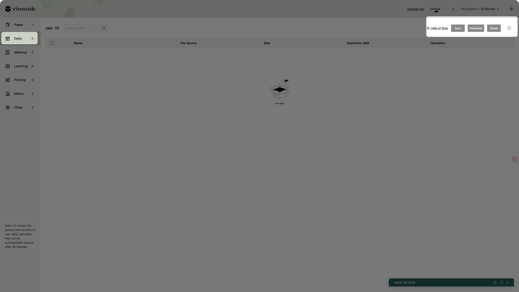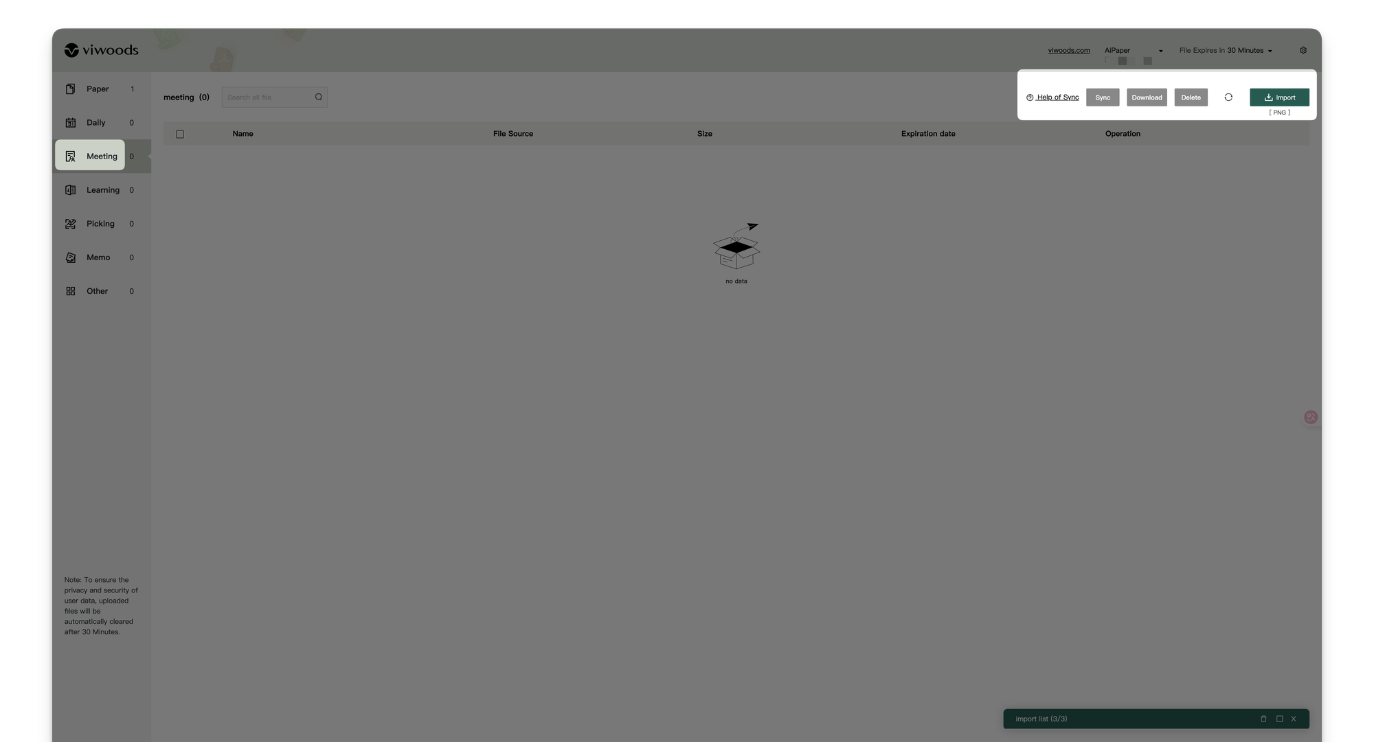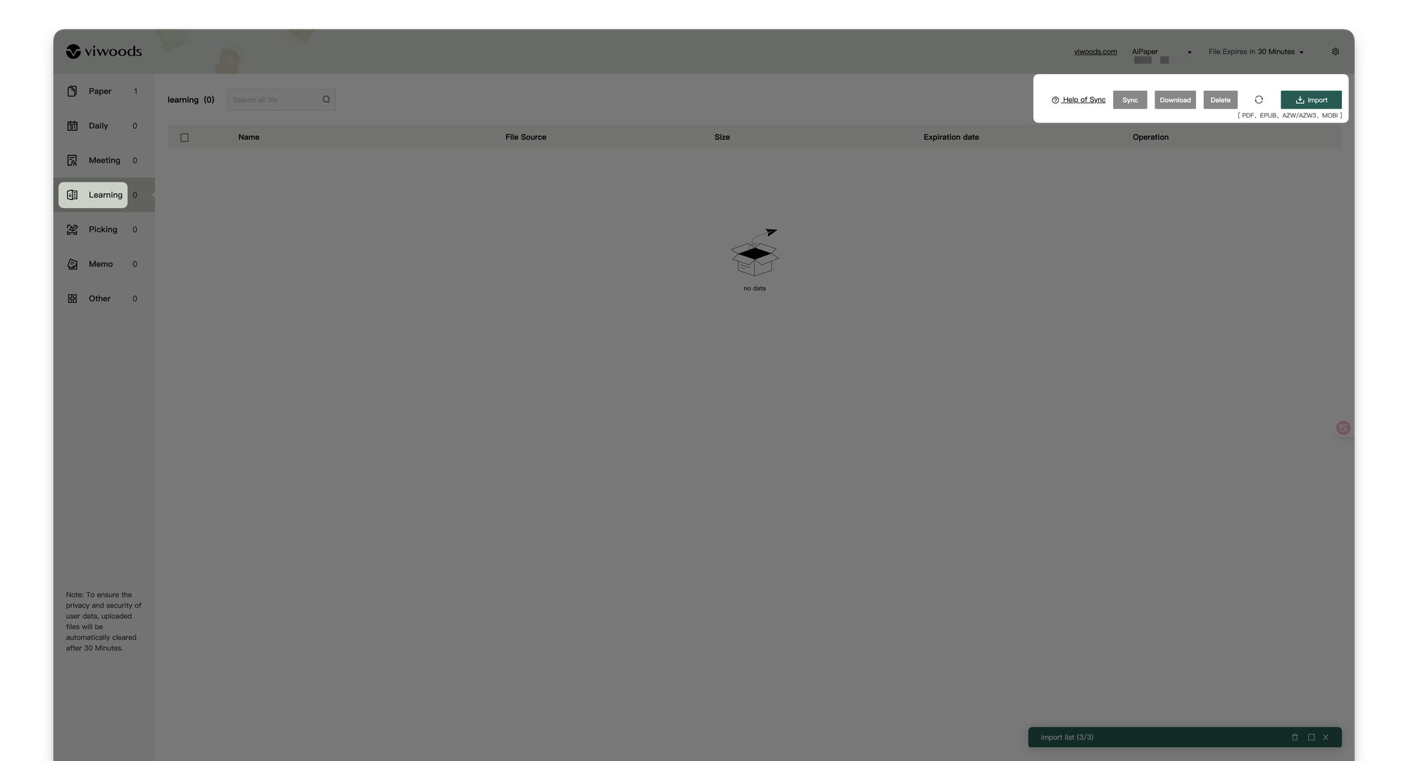 如果你没有同时使用 Viwoods 的设备,那么你几乎不用考虑云同步的功能。需要上传文件?128GB 的本地储存完全够用了。那么,过去两周,我使用最频繁的传输功能是 Viwoods 自带的 ViTransfer。在移动端或 PC 端访问网址 my.viwoods.com 并登录,即可上传文件。